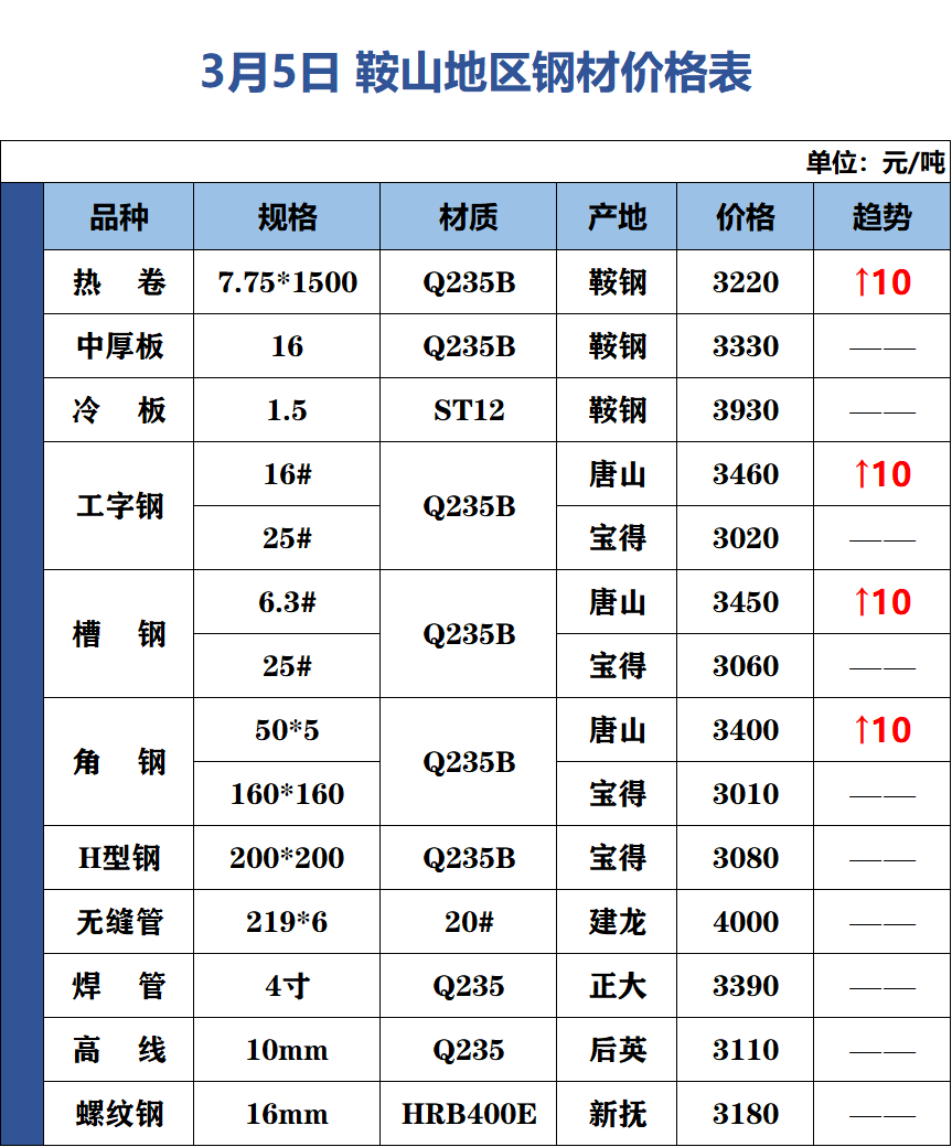 3月5日 鞍山地區(qū)鋼材價格表
