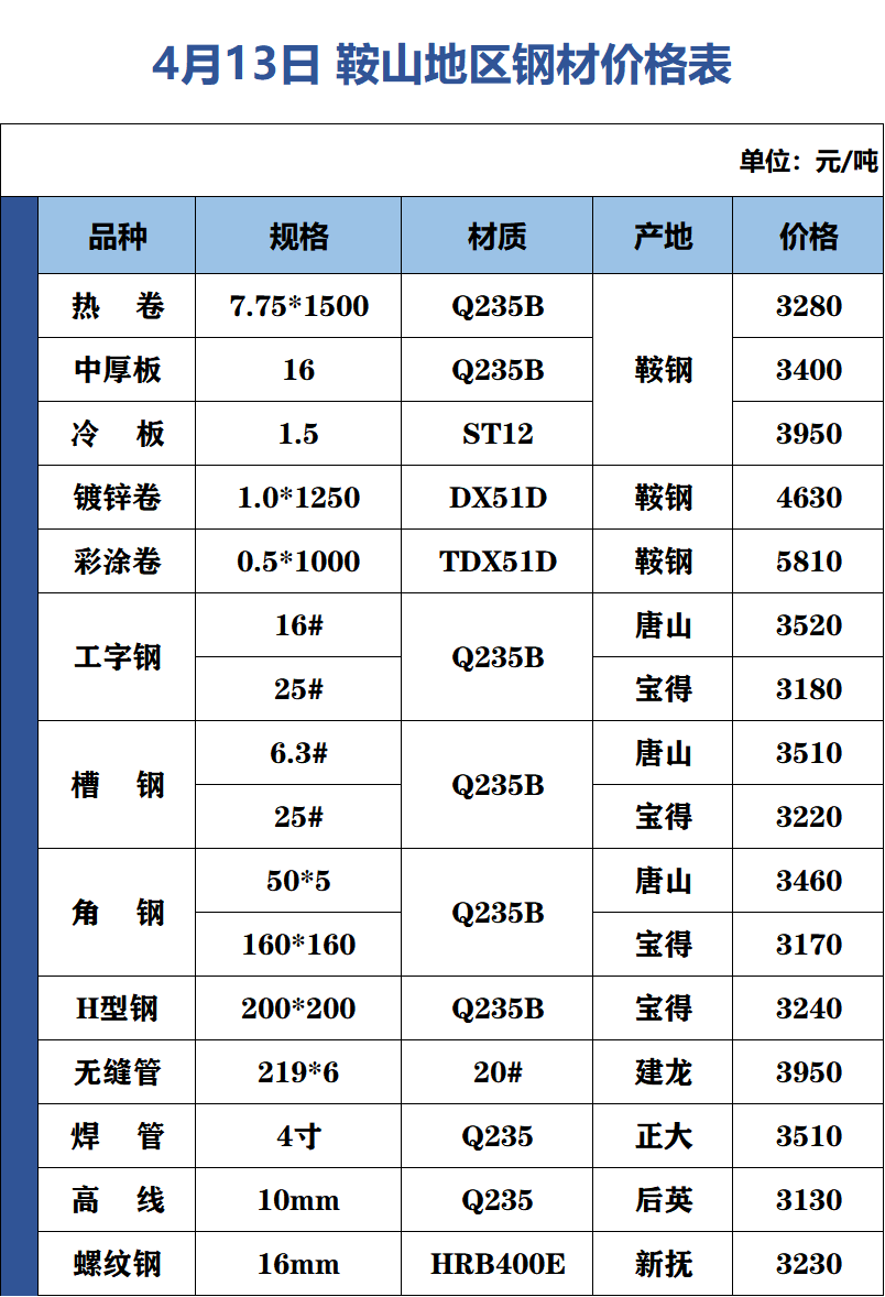 4月13日 鞍山地區(qū)鋼材價(jià)格表