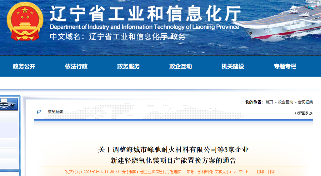 按照《遼寧省人民政府辦公廳關(guān)于推進(jìn)菱鎂行業(yè)高質(zhì)量發(fā)展的實施意見》(遼政辦發(fā)〔2023〕15號)、《省直7部門關(guān)于做好菱鎂行業(yè)專項整治有關(guān)工作意見的函》(遼發(fā)改工業(yè)字〔2026〕8號)、《遼寧省菱鎂礦浮選及鎂砂行業(yè)產(chǎn)能置換辦法》(遼工信建材〔2024〕18號)要求,根據(jù)企業(yè)的調(diào)整申請及鞍山市工信局初審,我廳于2026年3月31日至4月15日,對海城市峰馳耐火材料有限公司等3家企業(yè)新建輕燒氧化鎂項目產(chǎn)能置換方案進(jìn)行了公示,公示期間無異議,現(xiàn)予通告。